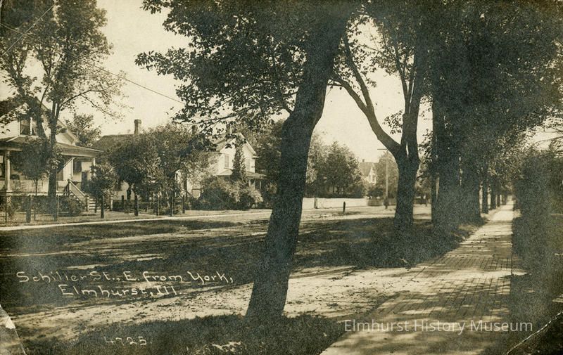 Written on front in white: Schiller St. E from York, Elmhurst, IL Typed on paper on back: In 1920's / First house from York St. belonged to John Krishack / 119 Schiller - NOT shown on postcard / 123 Schiller - Mrs. Catherine Darmstedt / 131 Schiller-with white fence-was home of Ralph H. Mears-Geo. E. Bright (later Bright Auto & Repair was on Schiller)