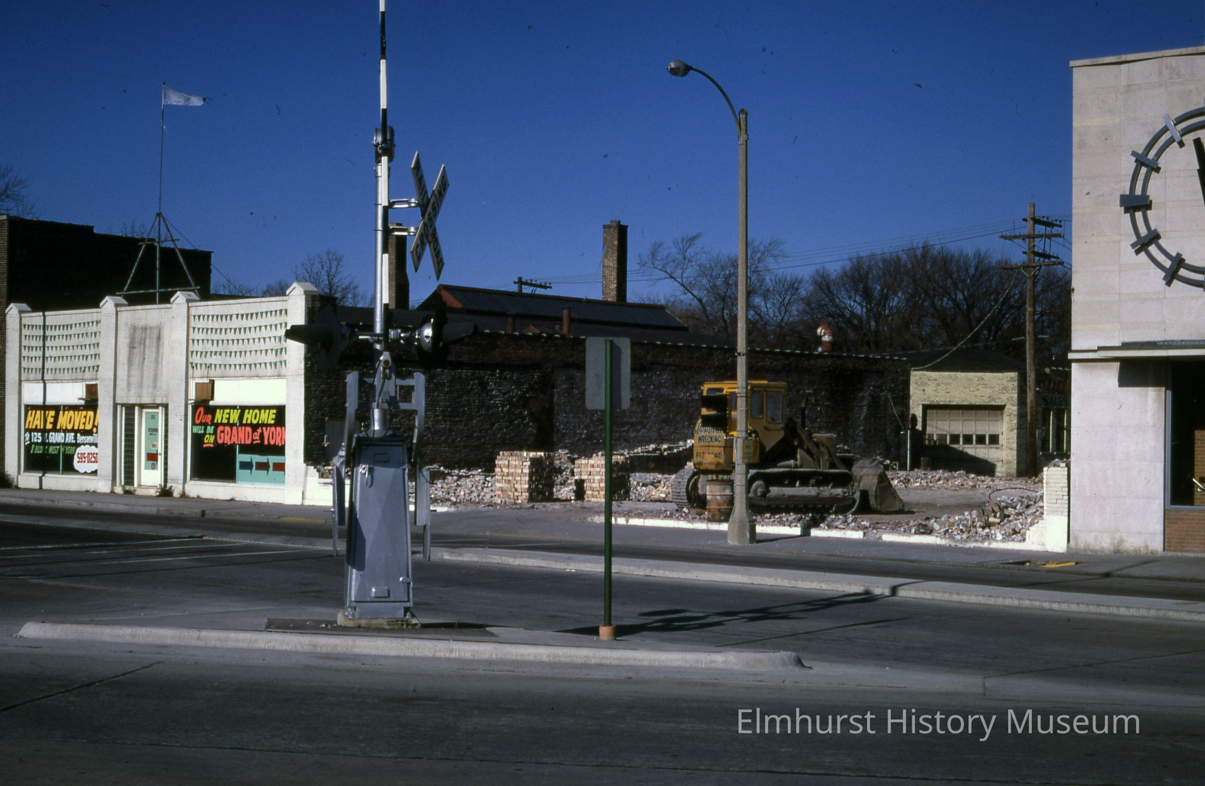 Demolition of the Ed Schram Buick garage on W. First Street, west of Elmhurst Federal Savings & Loan.Photograph Details