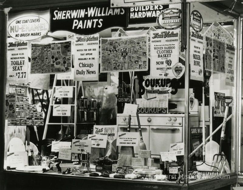 Window display of Soukup's Hardware Store at 116 N. York Street.