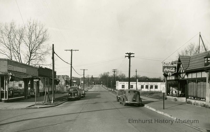 Spring Road looking north from the Chicago Aurora & Elgin Railroad tracks. MacMain's Delicatessen and Spring Road Motors are visible.