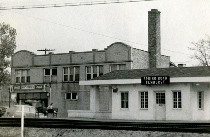 Chicago Aurora & Elgin railroad station at Spring Road. The Carlson Building at 500 Spring Road is visible on the southwest corner of Spring Road and it was presently known as Prairie Path Lane.Photograph Details