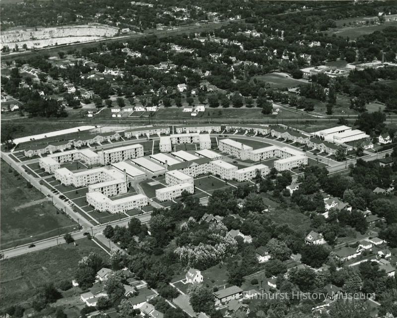 An aerial view of the St. Charles West Apartment and Co-op complex, on the northeast corner of St. Charles Road and West Avenue, looking northeast.Photograph Details
