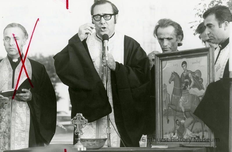 Pastor speaks at the dedication of the St. Demetrios Greek Orthodox Church addition at 893 N Church Road. (A red 'x' crosses out the left of the photo, where it would have been cropped for a newspaper)Photograph Details