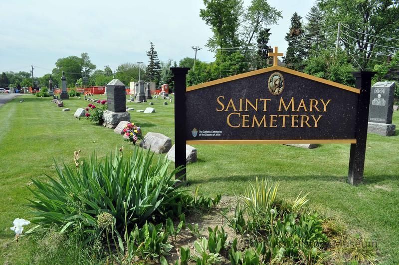 Entrance sign to St. Mary Catholic Cemetery, to the immediate west of St. Peter's Cemetery. Elmhurst College is visible in the background.Photograph Details