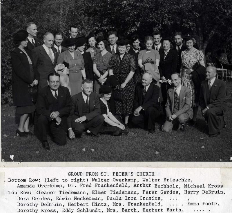 Group of men and women from St. Peter's Church. Bottom row left to right-Walter Overkamp, Walter Brieschke, Amanda Overkamp, Dr. Fred Frankenfeld, Arthur Buchholz, Michael Kross Top row-Eleanor Tiedemann, Elmer Tiedemann, Peter Gerdes, Harry DeBruin, Dora Gerdes, Edwin Neckerman, Paula Irion Crusius, unidentified, Dorothy DeBruin, Herbert Hintz, Mrs. Frankenfeld, unidentified, Emma Foote, Dorothy Kross, Eddy Schlundt, Mrs. Barth, Herbert Barth, unidentifiedPhotograph Details