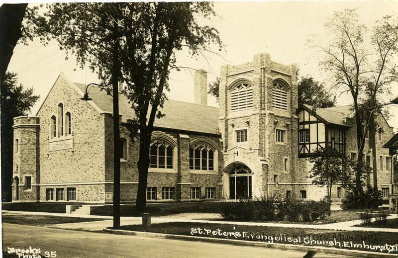 St. Peter's Evangelical Church, the view from Church Street. This image is the stone structure that replaced the frame church. Printed in white on the front is identification along with "Elmhurst, ILL. / Brooks Photo 35." Written in blue ink on the back is "May 11, 1934 / Lydia (underlined). Printed in stamp area in black "Defender / (diamond shape) / Defender." Manufacturer information is "Brooks Photos."Photograph Details