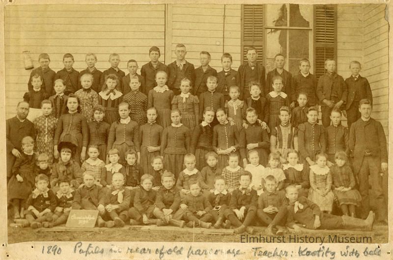 "1890/Pupils in rear of old parsonage/ Teacher: Kostitz(?) with bell"Notes