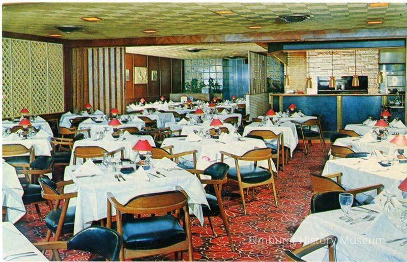 Printing in black on the back reads "Dining Room. Unequaled food, informal dining, open hearth cooking and casual atmosphere! Our succulent steaks and prime beef, tempting sea-food and savory fowl make every meal a pleasure. Stevens Restaurant 476 N. York Street. Corner York and U.S. 20, Elmhurst Illinois. For reservations, call TE 4-6611." Photographer Guy Carroll-Color Art, Elmhurst, Ill
