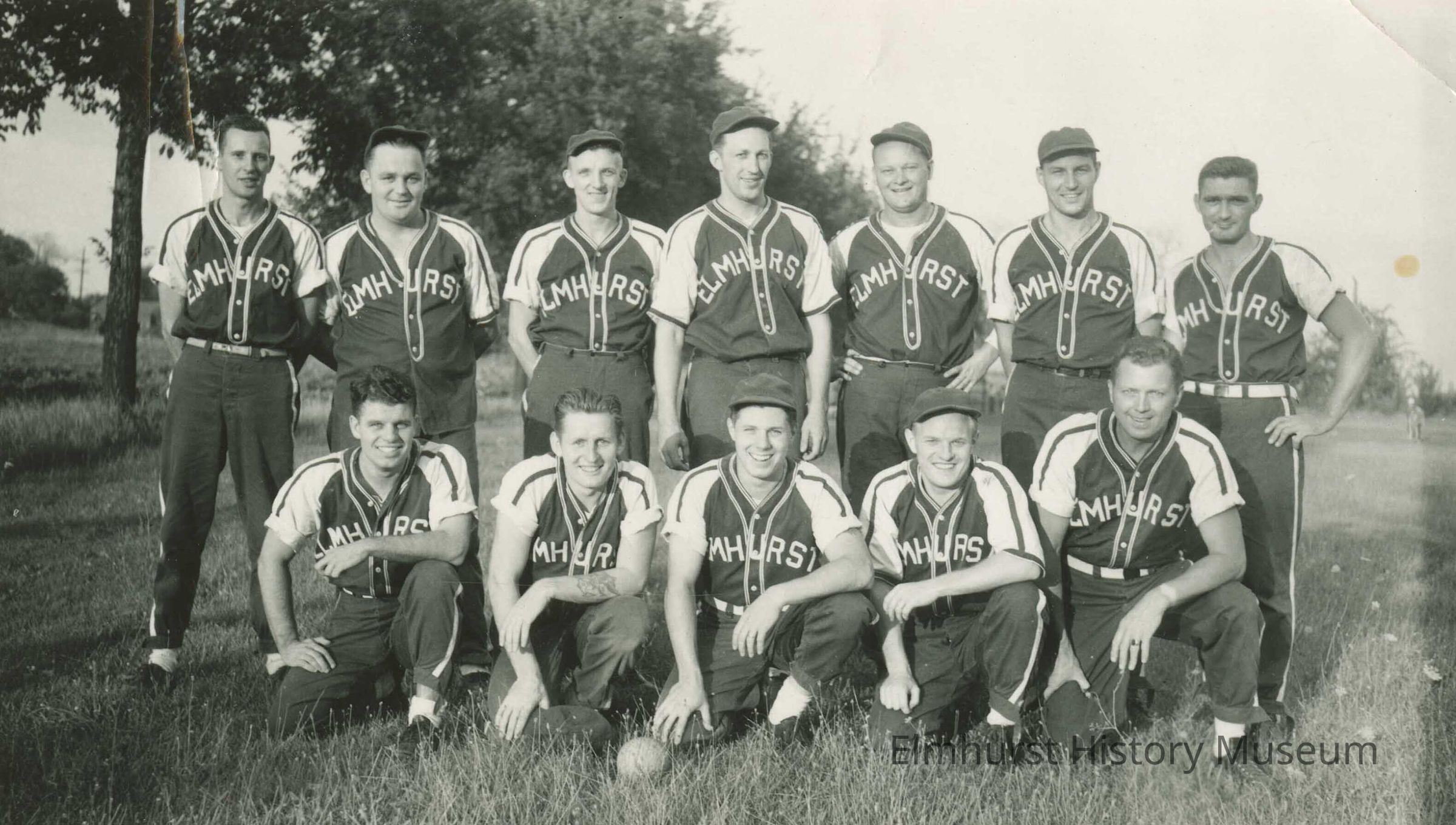 Players were identified August 22, 1994 by Fran Kulton. Left to right on bottom row which is kneeling are Johnny Burke, unknown, Don Olsen, Ted Hobein, George Kulton. Top row is Clyde Metz, Al Kentgen, Joe Mann, Jack Dagley, Wally Baucke, unknown, Rich Galvanic. Penciling on the back reads "one-Crushers / Champs of 194." Number 838 is inked in upper left back corner. A typewritten paper with date and names of team members was with the photo; it was provided by Fran Kulton, wife of team member George Kulton.