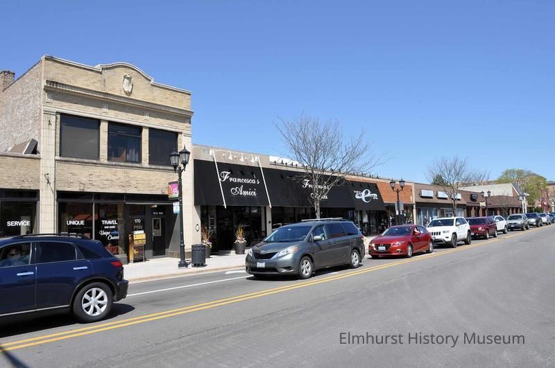 Storefronts on the west side N. York Street, north of Second Street. Stores include Unique Travel at 170 N. York, Francesca's Amici restaurant, and Efthimia Day Spa.Photograph Details