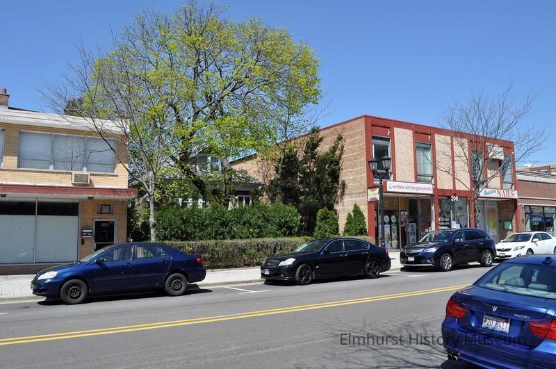 Storefronts on the west side of N. York Street. The house at 202 N. York is center, and Edible Arrangements and Holiday Nails are visible at right at 206 N. York.Photograph Details