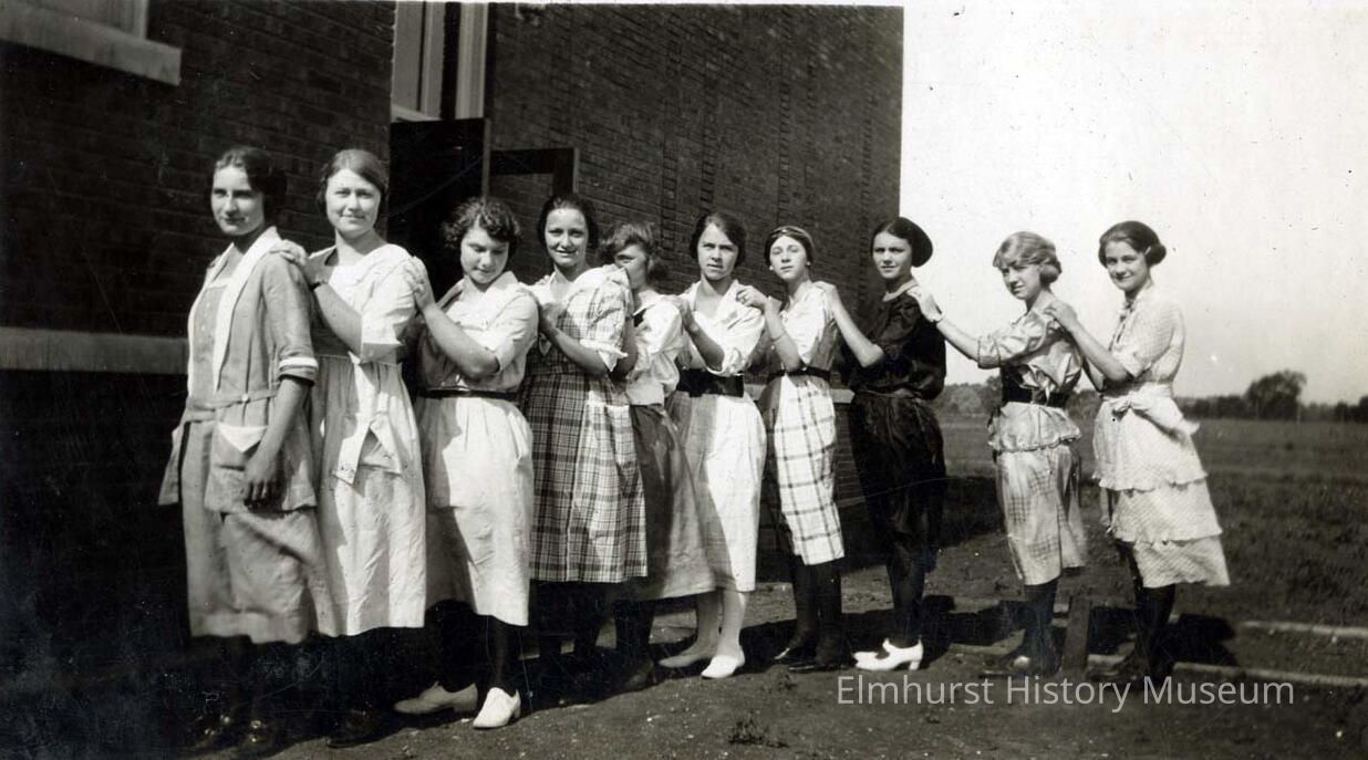 Ten girls, presumably students, pose for a photograph outside York Community High School.Photograph Details