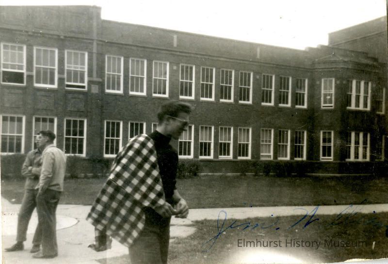 Students standing outside York Community High School. "Jim Williams" is written in blue ink on the photograph.Photograph Details