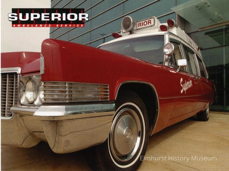 Advertisement in postcard format. Image of a vintage "Superior" ambulance. Superior Ambulance Service, 395 W. Lake Street, Elmhurst.Photograph Details
