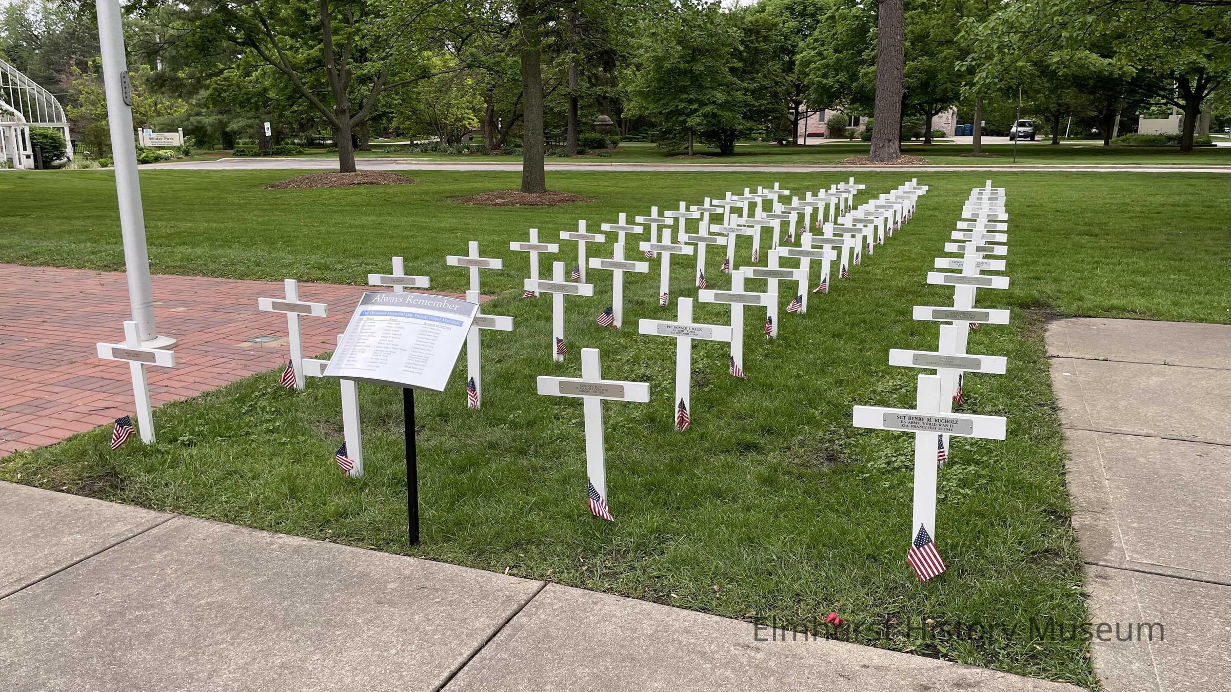 A temporary Memorial Day monument set up next to the Veterans Memorial in Wilder Park, indicating a cross for every Elmhurst veteran killed in action while in military service, in place for 2022 Memorial Day ceremonies.Photograph Details
