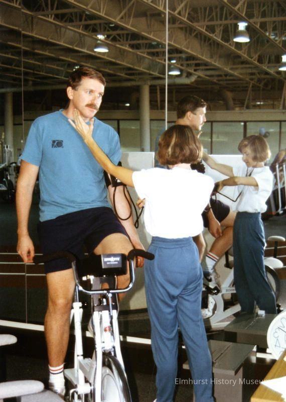 A woman taking blood pressure of a man on a stationary bicycle at Courts Plus.