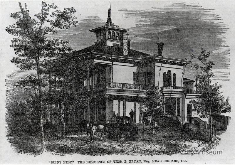 on front: "Bird's Nest." The residence of Thos. R. Bryan, Esq., near Chicago, Ill. on back: Bryan, Thomas Byrd's Nest House built in 1857-59 at SW corner of York and St. Charles