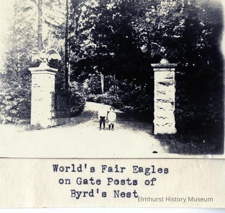 on back: Entrance Gate to Byrd's Nest Estate St. Charles Road at the Foot of Cottage Hill Avenue After the World's Fair in 1893, Mr. Bryan brought two great white eagles from the manufacturer's building to surmount the gateposts of Byrd's nest, where for years they were one of Elmhurst's beauty spots. Through these gates came many notable visitors from all over the country and abroad.