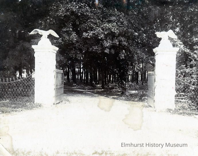 Entrance of the Thomas Bryan Estate, "Bird's Nest," at Cottage Hill Avenue and St. Charles Road. The two eagles were brought to the estate from the Columbian Exposition in 1893.Photograph Details