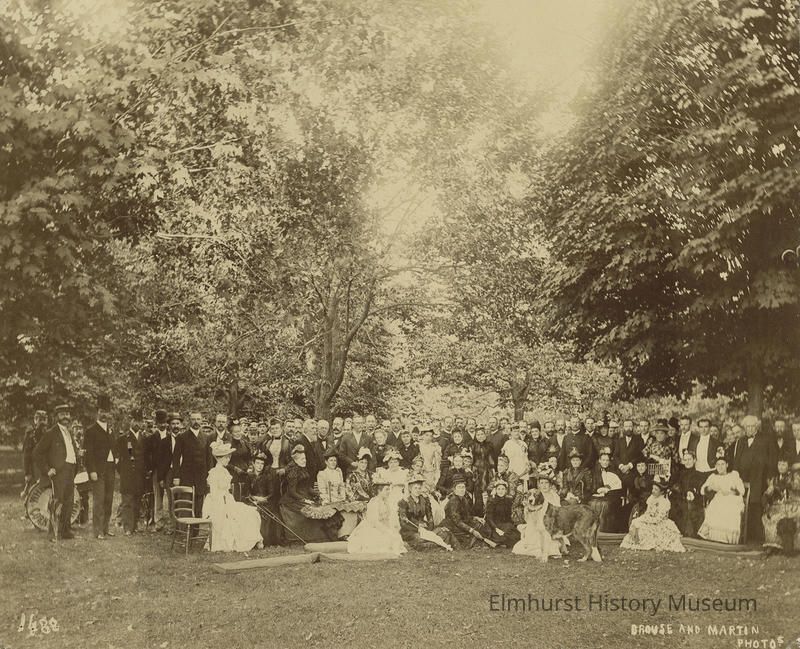 A reception of the Foreign Commissioners of the Chicago World's Fair (also known as the World's Columbian Exposition) at Thomas Bryan's estate, Bryd's Nest, in Elmhurst. The estate was on the south side of St. Charles Road between York Street and Cottage Hill Avenue.Photograph Details