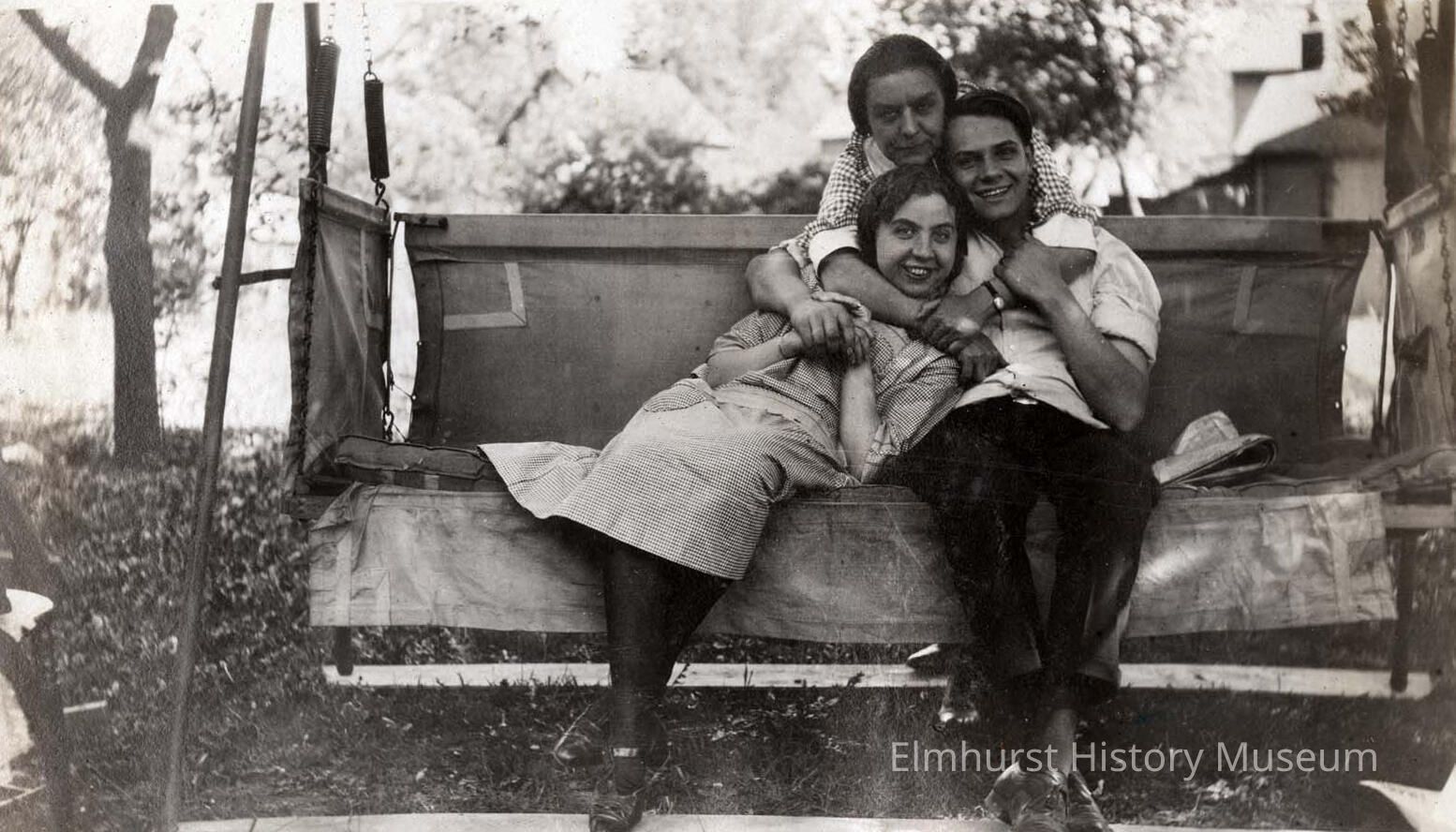 A young woman (Laura Schumacher Raab), an older woman, and a young man (possibly Arthur Schumacher) pose for a photo on a swing bench.Photograph Details