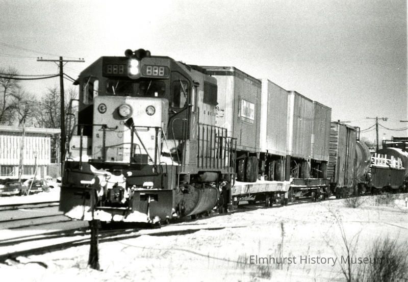 Westbound freight train with one locomotive (usually there are 2 or more) on the Chicago & North Western Line at Myrtle Avenue.Photograph Details