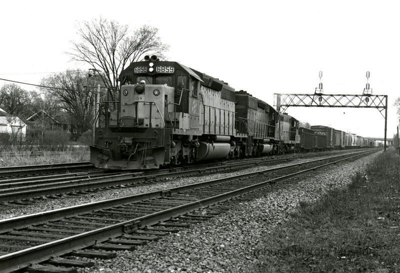 Train number 381 pulled by 2 locomotives, 2 3000 HP 5040-2's and a 1500 HP 6P7, on the Chicago & North Western line at Poplar Avenue.Photograph Details