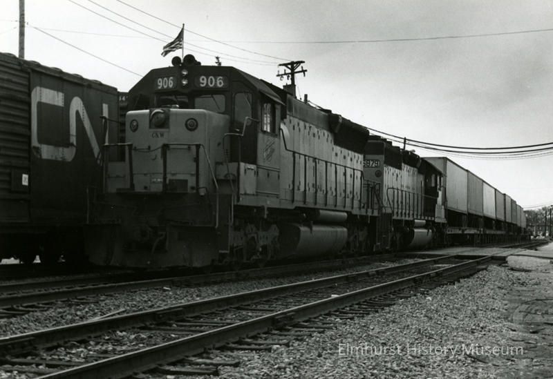 Eastbound freight train, number 242, pulled by 2 locomotives a 3600 HP SD45 and a 3000 HP SD40-2, on the Chicago & North Western railroad line at York Street.Photograph Details
