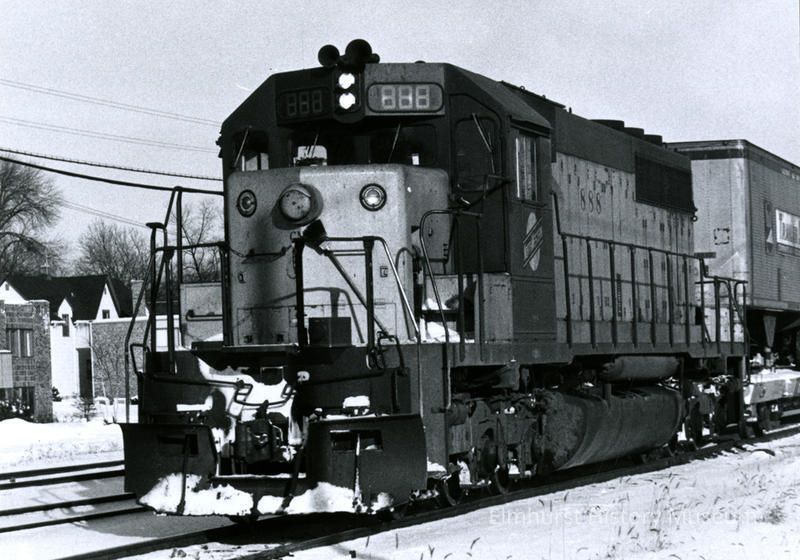 3000 HP SD40, locomotive 888 built in 1966, showing the distinctive nose-mounted bell on the Chicago & North Western railroad line.Photograph Details