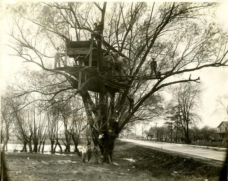 Boys posing in a tree house possibly near St. Charles Road in Elmhurst