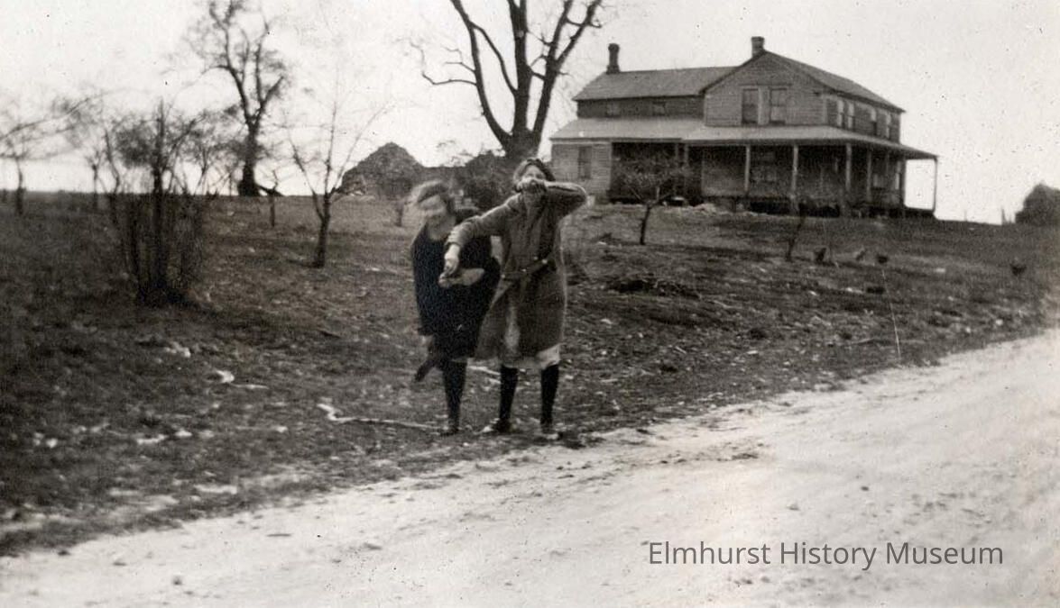 Two young women in front of a farmhouse, unready for a photo.Photograph Details