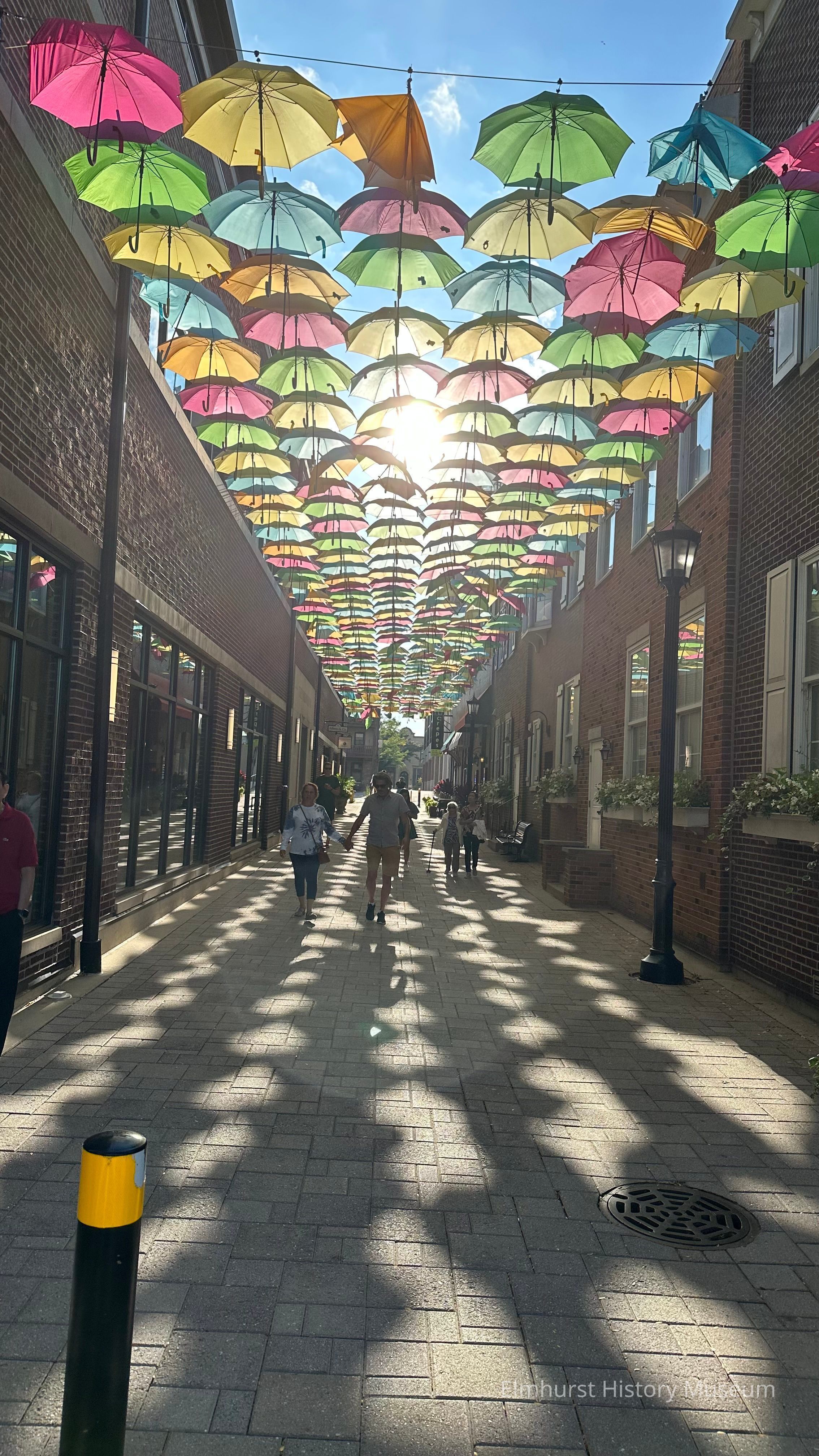 Umbrella Sky Elmhurst art installation at Schiller Court, looking west from N. York Street.Photograph Details