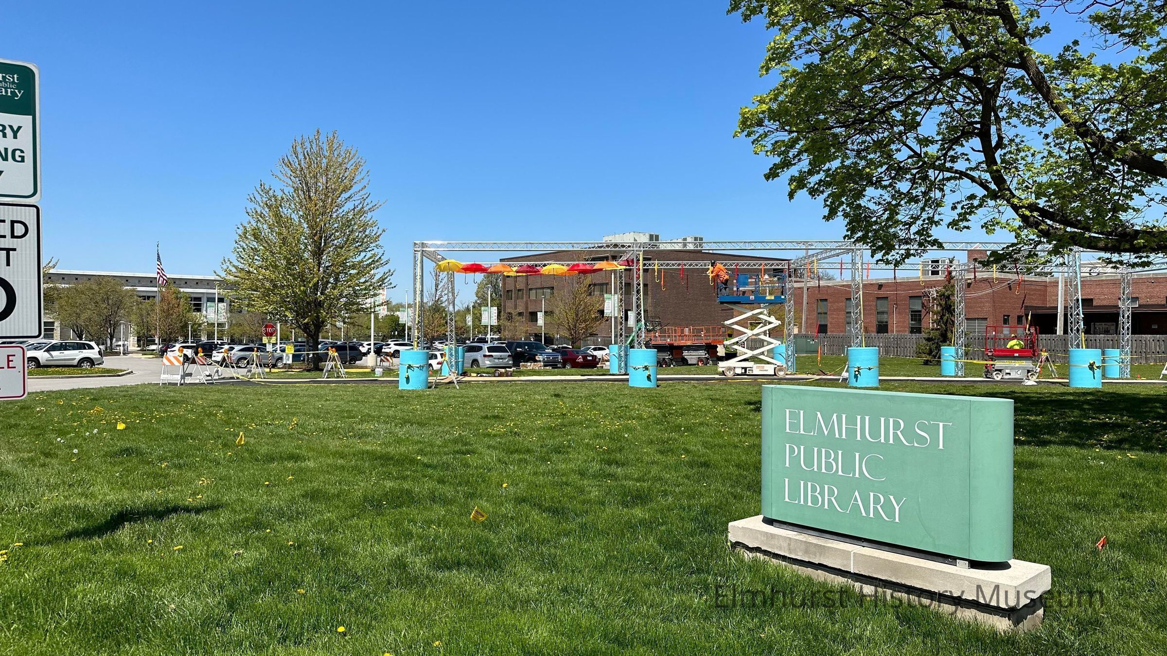 Umbrella Sky Elmhurst art exhibit installation at the Elmhurst Public Library.Photograph Details