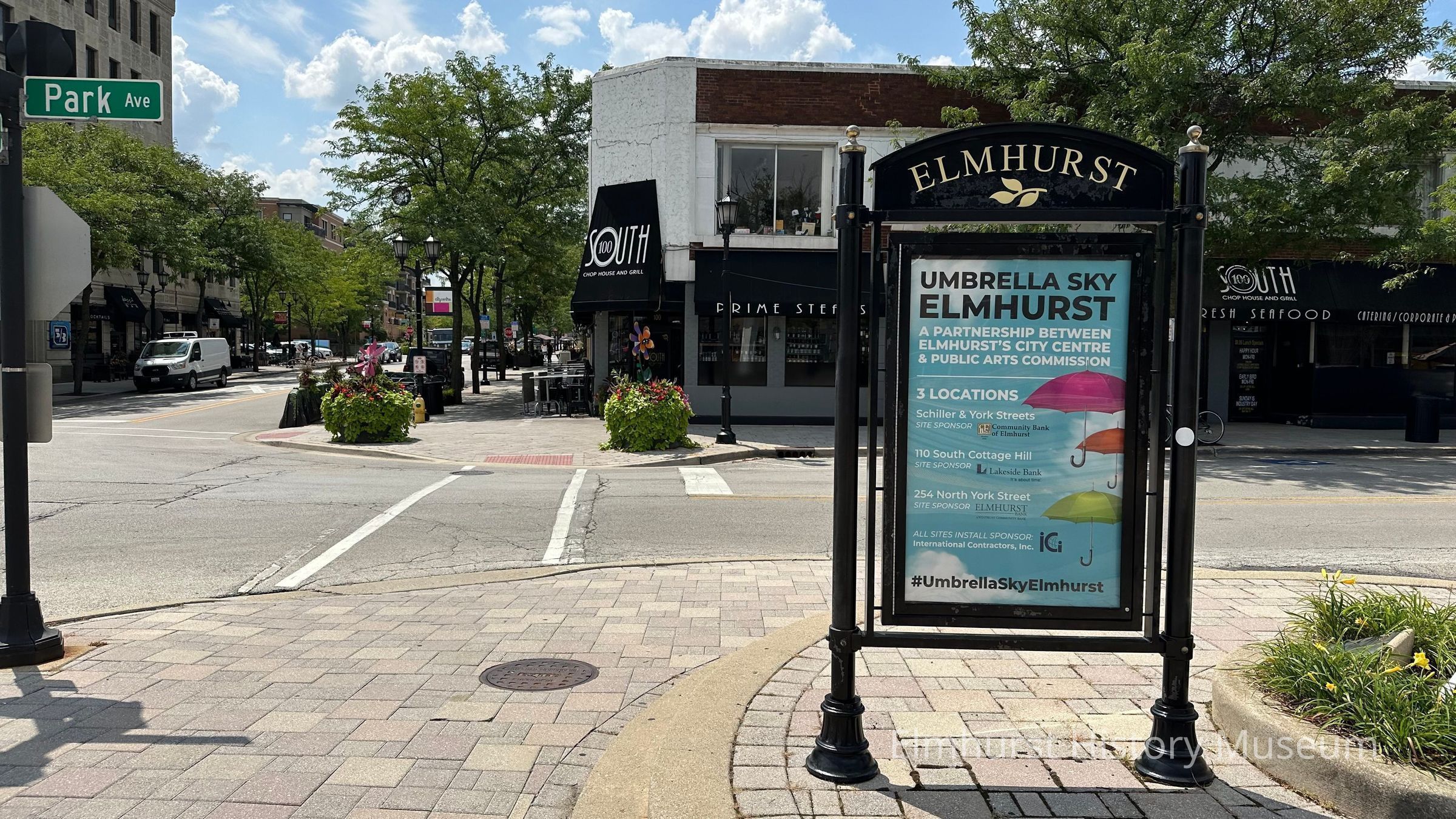 Signage at the northwest corner of York Street and Park Avenue describing the Umbrella Sky Elmhurst exhibits, looking south.Photograph Details