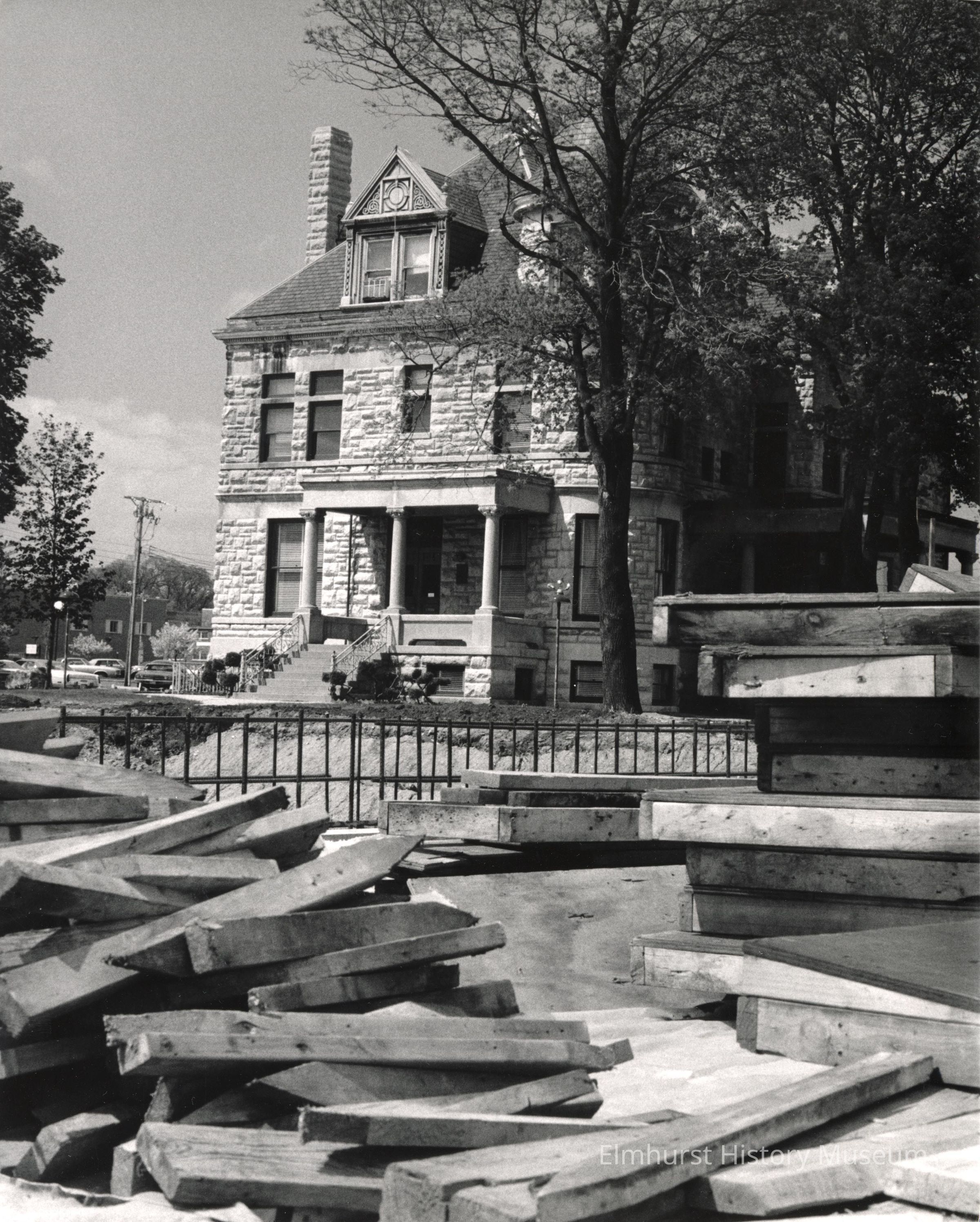 View of the Glos Mansion from the E. Park Avenue bridge during the construction of the underpass.Photograph Details