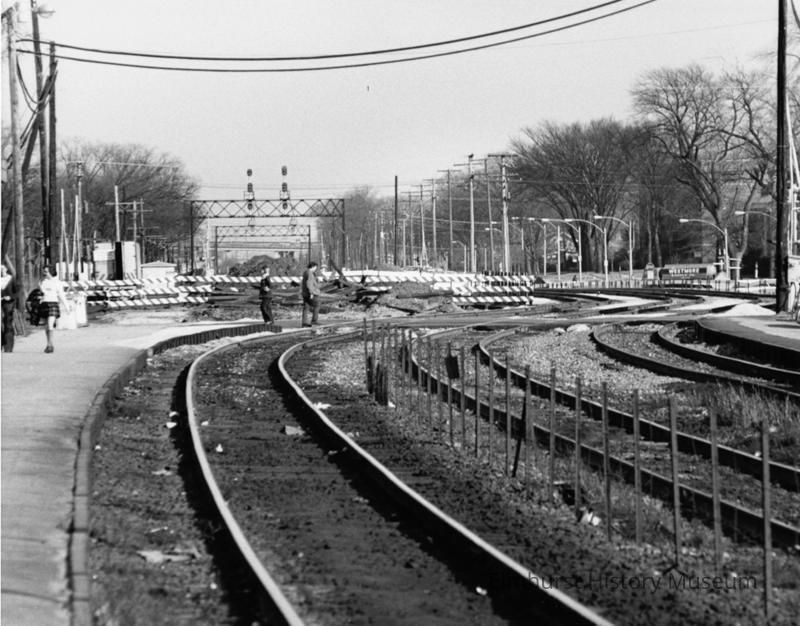 Photo Identification hand-written on the back of the print: "Elmhurst Underpass Program: Telephoto view looking E. from CNWRR station platform showing 'shoo fly' tracks temp. moved southward onto E. Park Av. York St. crossing showing" There is a blue stamp in lower right corner on the back "Photo by Bob Kross Elmhurst, Illinois" The photo is dated Feb 1977.