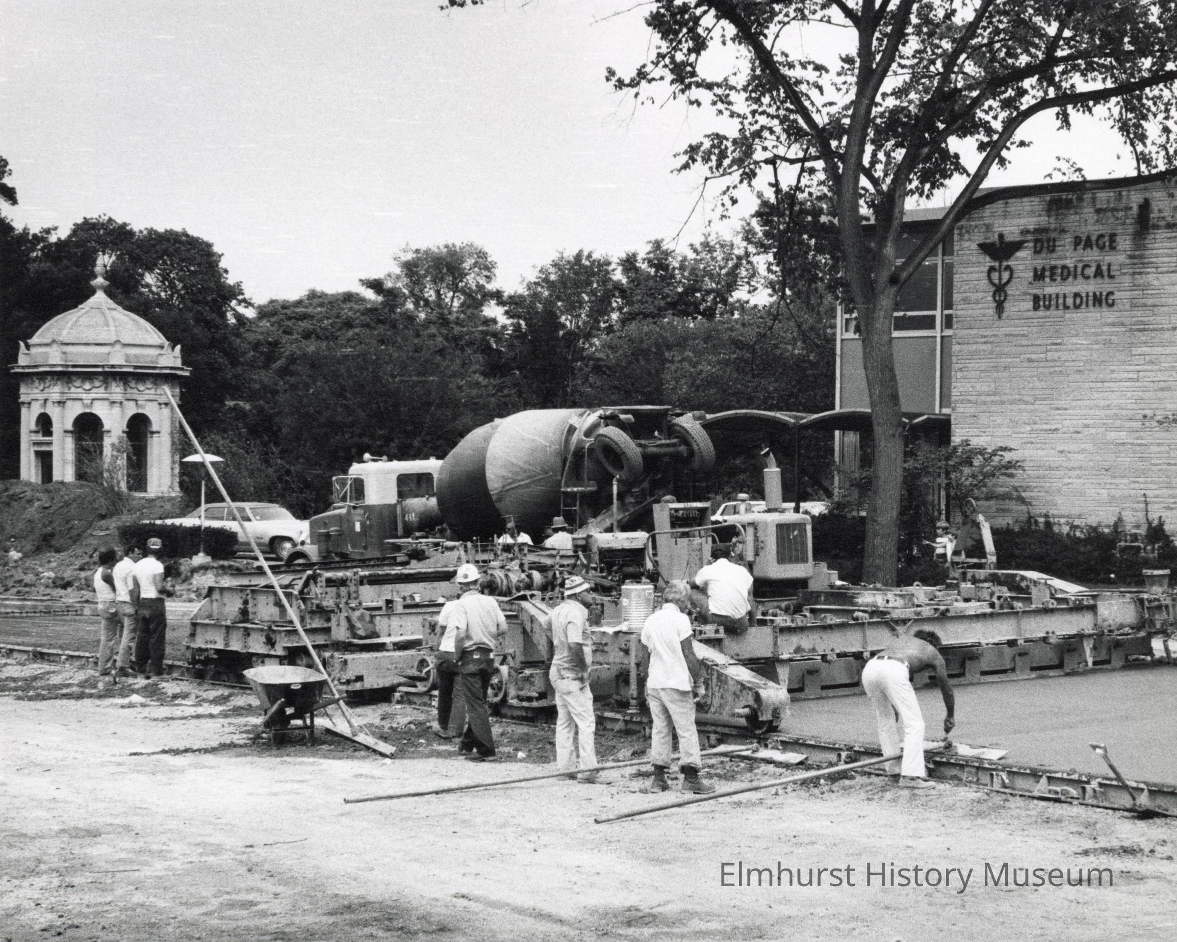 Roadway construction on S. Kenilworth Avenue during the installation of the underpass, looking southeast. The Glos Mausoleum is in the background.Photograph Details