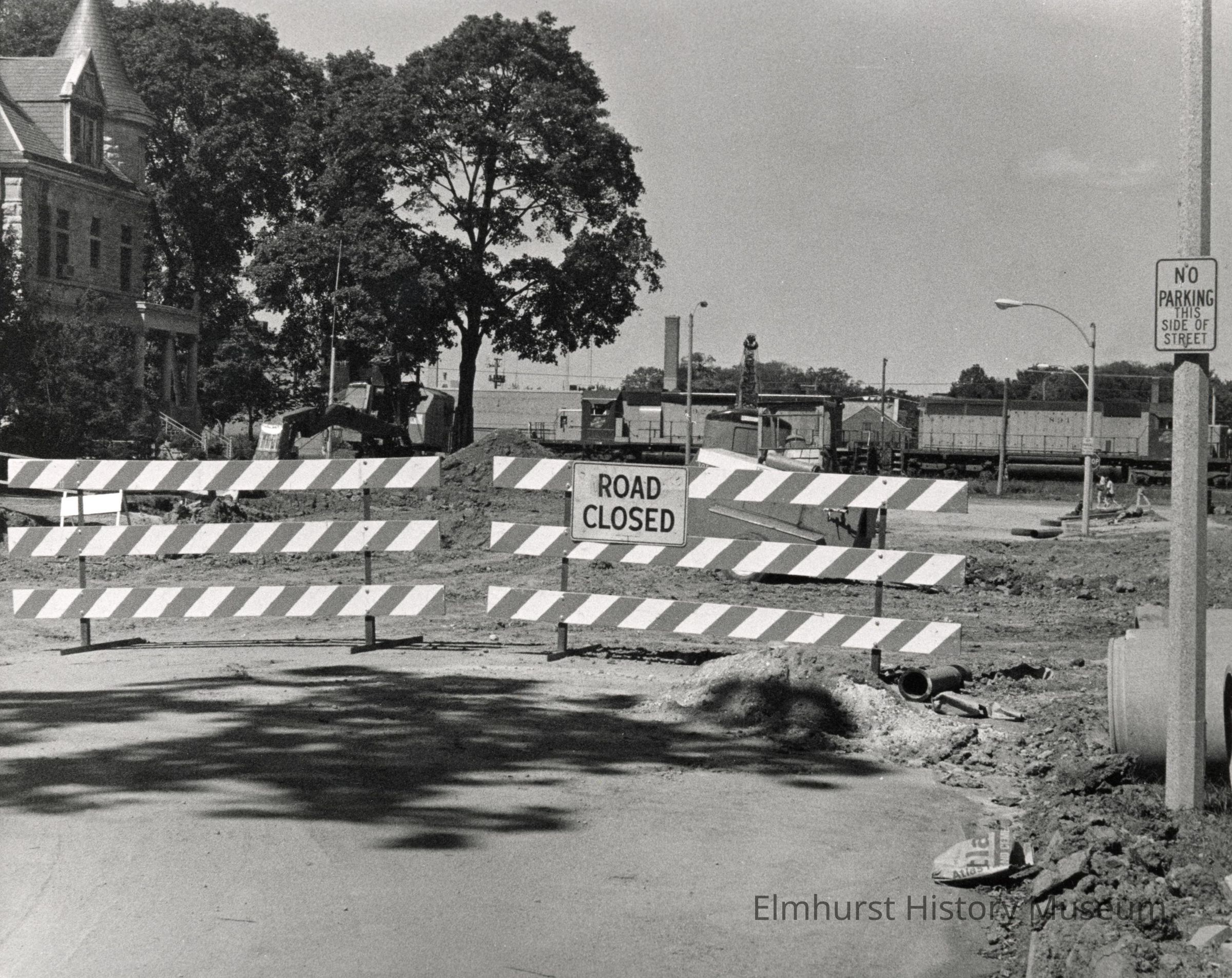 "Elmhurst Underpass Program: S. Kenilworth Ave looking N. toward Park Ave and CNW RR. Roadway in first stage of removal. Glos Mansion, left."
