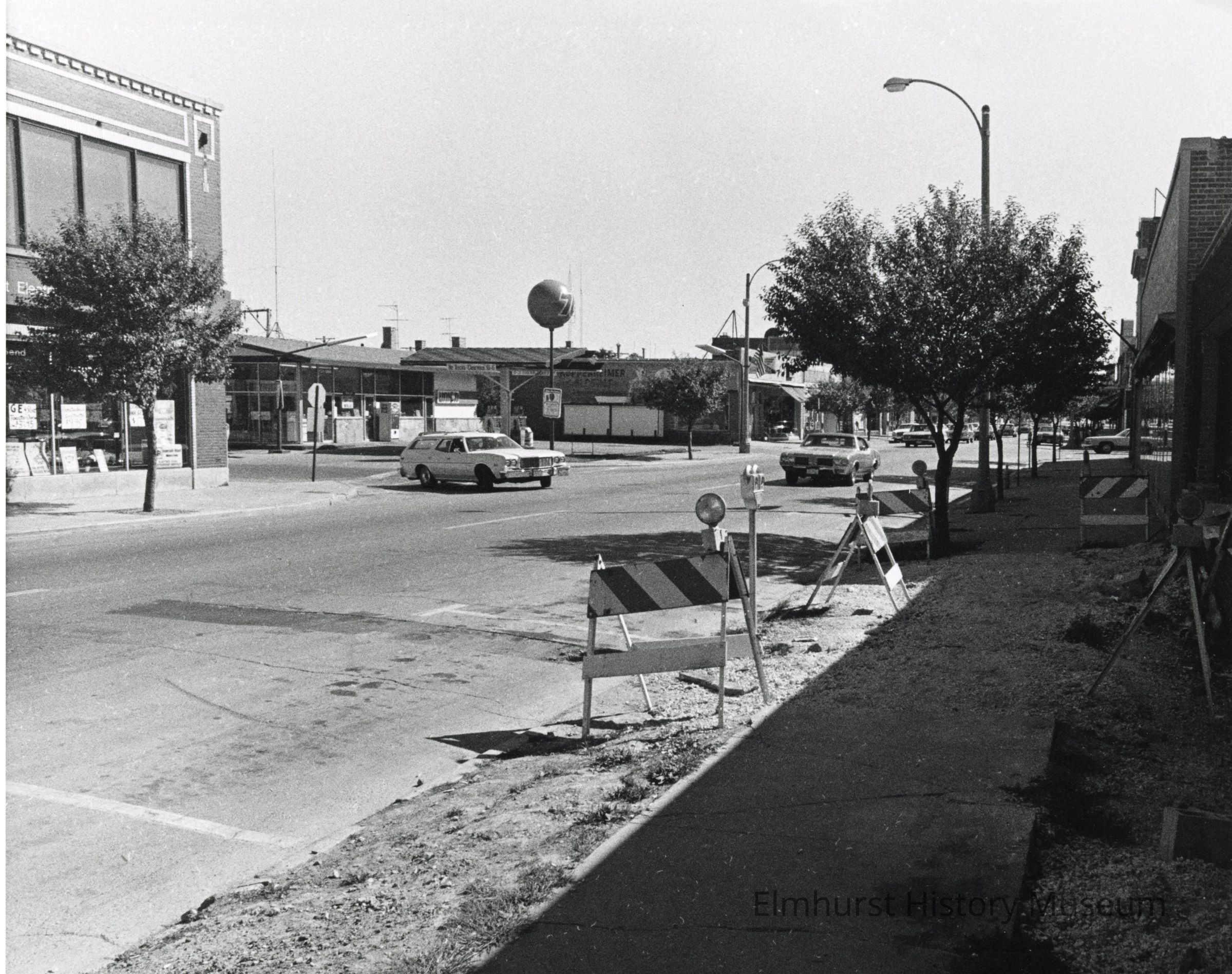 "Elmhurst Underpass Program: N. York Street looking SE. Car turning out of Elmhurst Ave. Ford Garage (Midwest Electric), Left: 76 gas station and first structure beyond to be removed for N. end of underpass. New west suburban stationary building under construction, right."