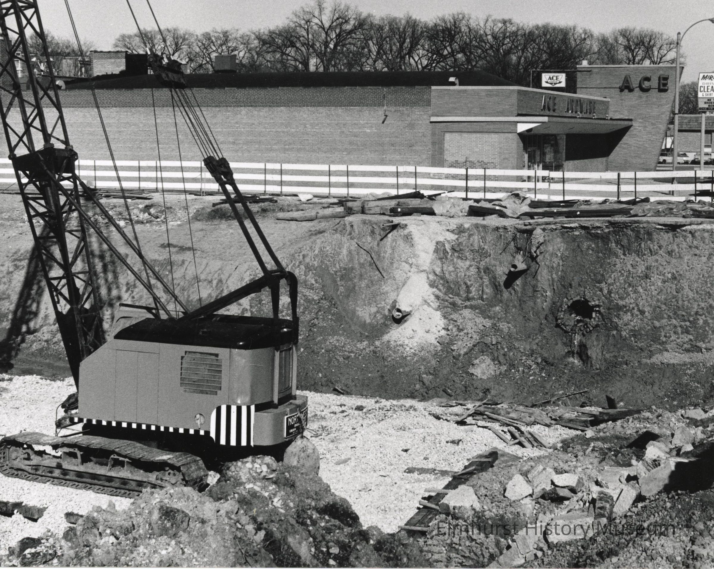 Construction of the underpass at Kenilworth Avenue, north of the Chicago and North Western Railroad tracks. Ace Hardware is visible in the background.Photograph Details