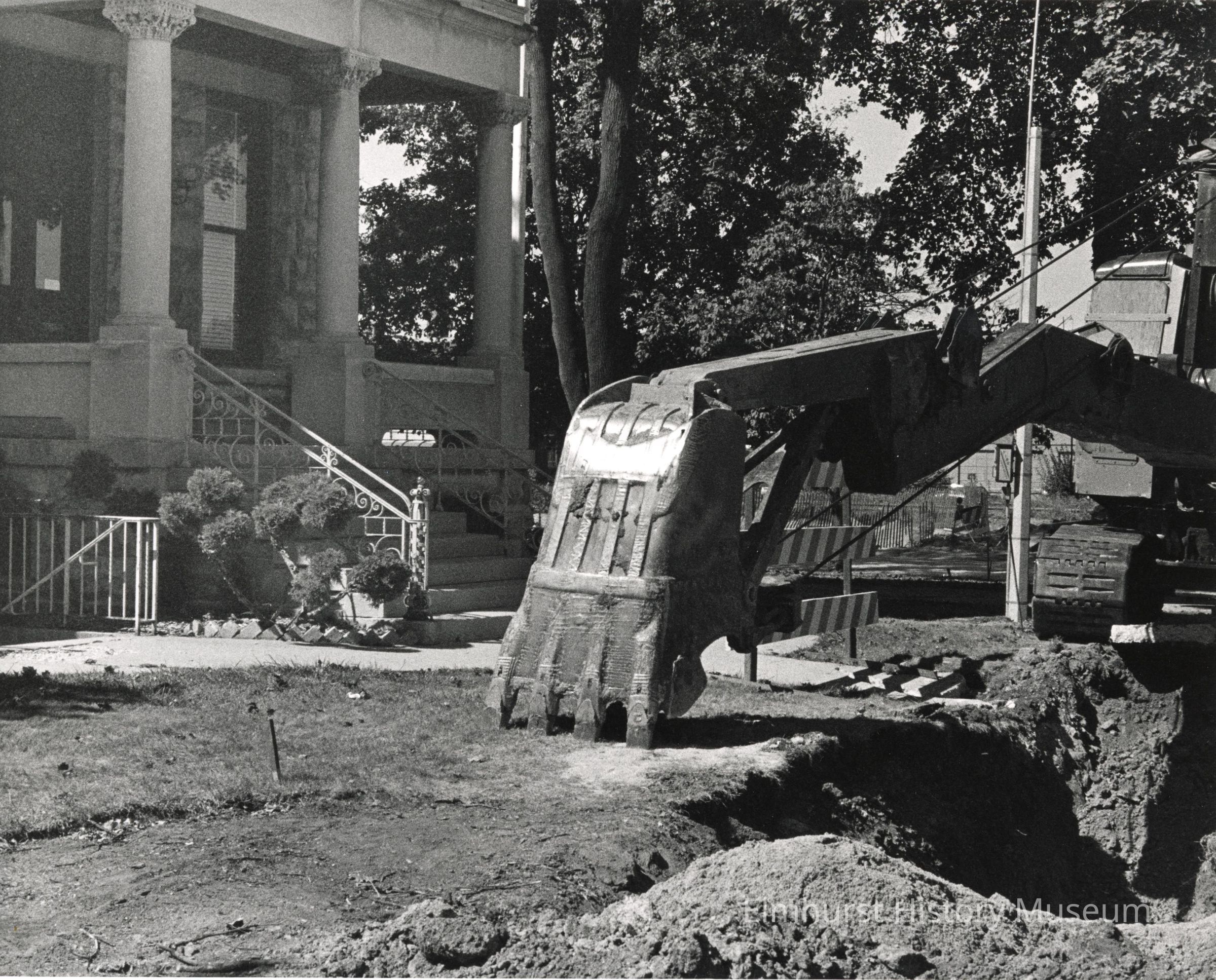 Construction equipment in the front lawn of the Glos Mansion during the underpass construction project.Photograph Details