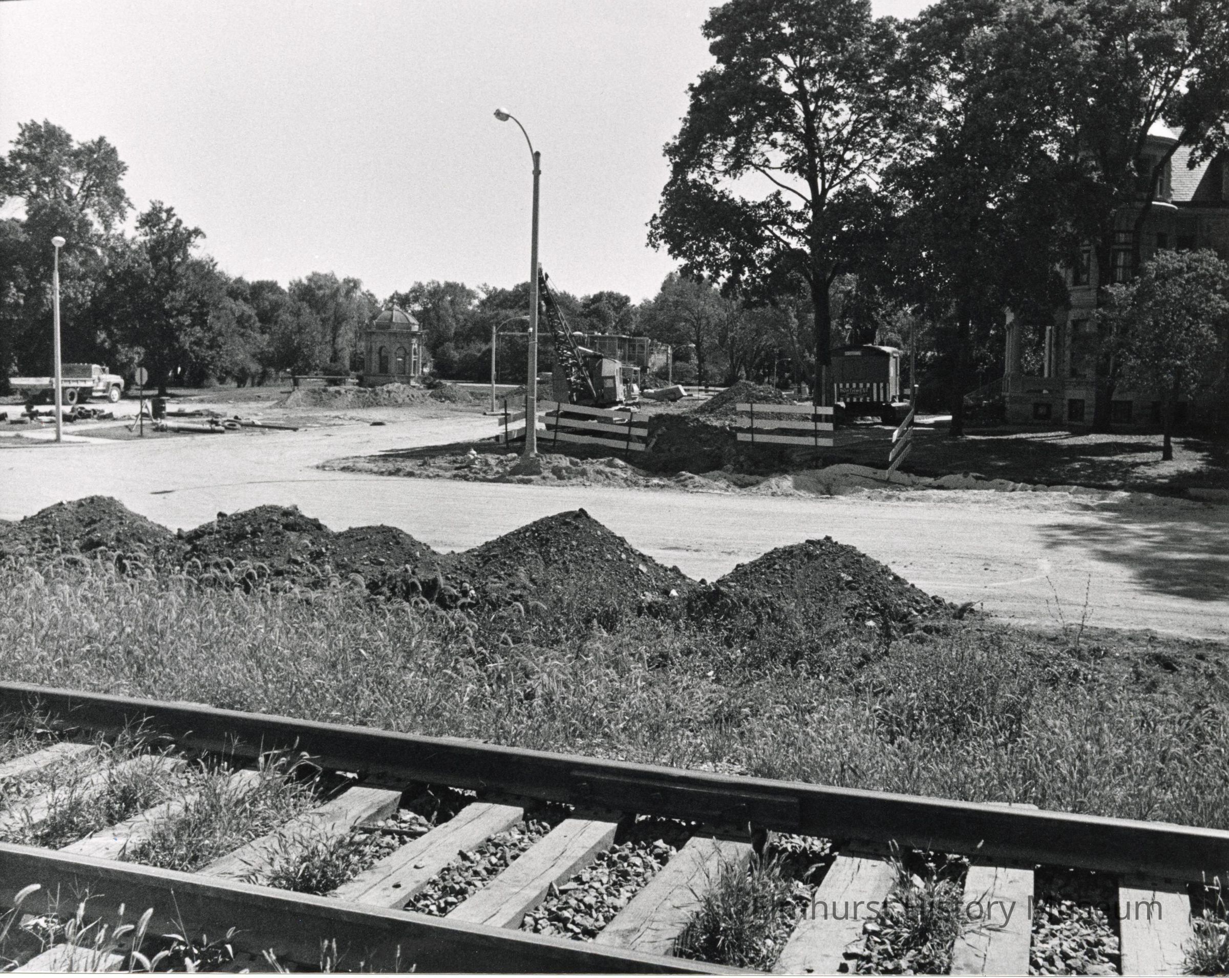"Elmhurst Underpass Program: Intersection of Park Ave and S. Kenilworth Ave will soon be non-existent. CNW RR tracks in foreground. Glos Mansion, right. (looking south)"