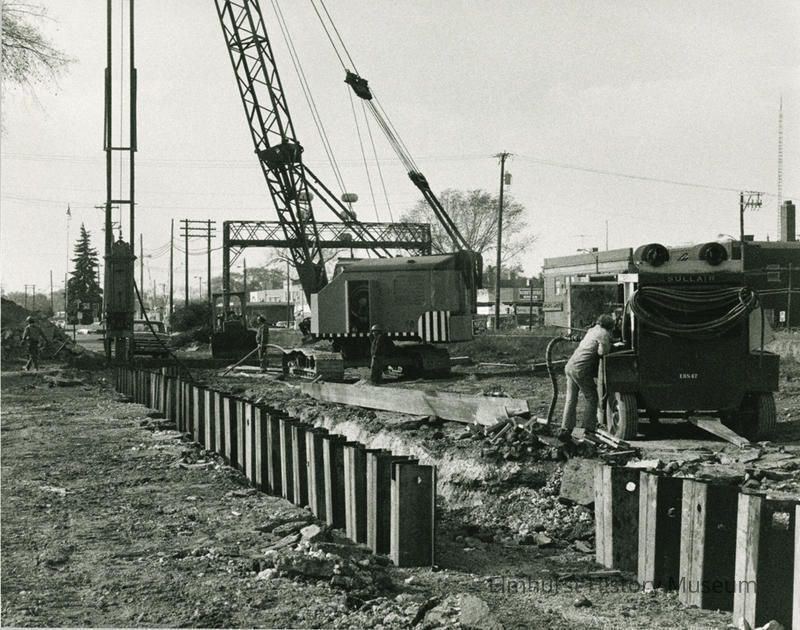 Handwritten identification on the back reads "Elmhurst Underpass Program: / Pilings on S. side of CNWRR tracks at site of underpass--1 Block E. of York St." Print is dated "Nov 1976."