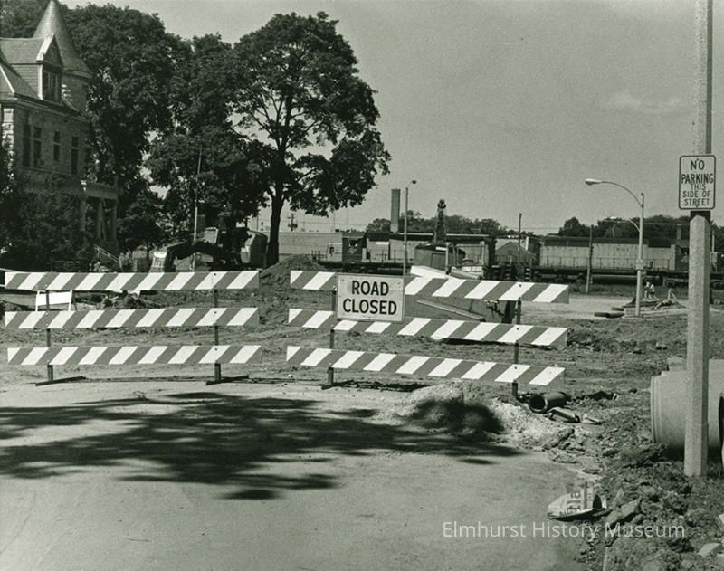 The intersection of Park and Kenilworth Avenues during the early stage of underpass construction, looking north. The Glos Mansion, 104 S. Kenilworth, is visible on the left.Photograph Details