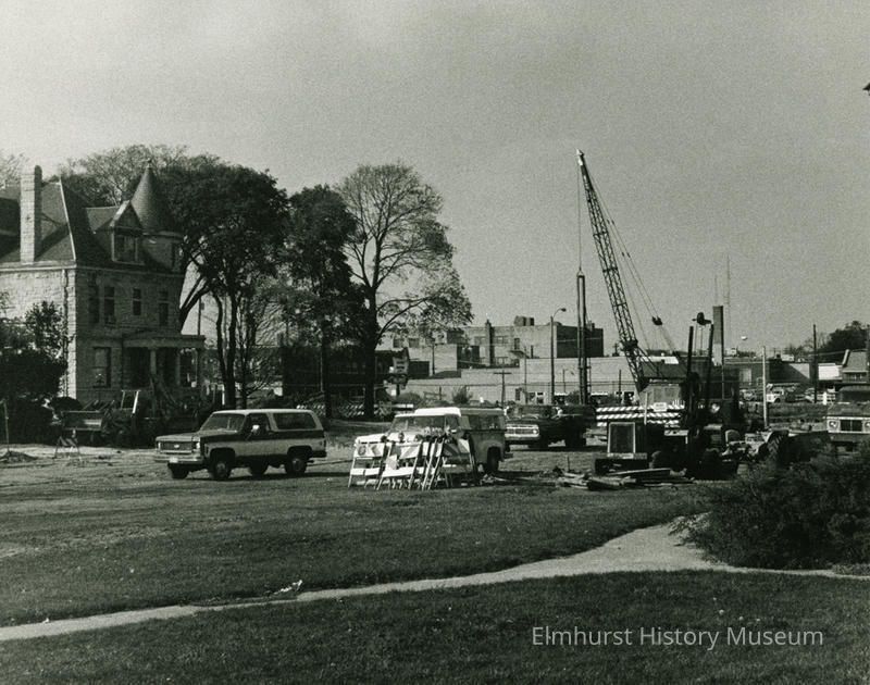 Underpass construction at Kenilworth and Park Avenues, looking northwest. The Elmhurst Historical Museum, housed in the Glos Mansion, is on the left.Photograph Details