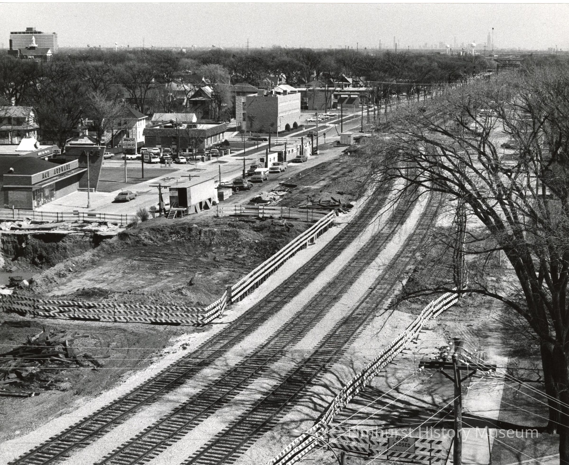 "Elmhurst Underpass Program: From atop the Elmhurst Nat'l Bank Building. CNW RR "Shoo Fly" - Temporary Replacement of tracks to permit excavation. Looking N.E. from (about) York St."