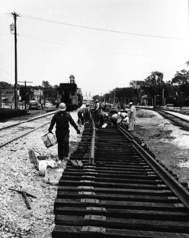Photo Identification hand-written on the back of the print: "Elmhurst Underpass Program: Looking E. from about York St. New CNWRR tracks being installed after months of using the 'shoo fly' (right) Mostly on E. Park Ave. There is a blue stamp in the lower right corner on the back "Photo by Bob Kross Elmhurst, Illinois."underlined) E. Park Ave." Print is dated "Aug 22, 1977."