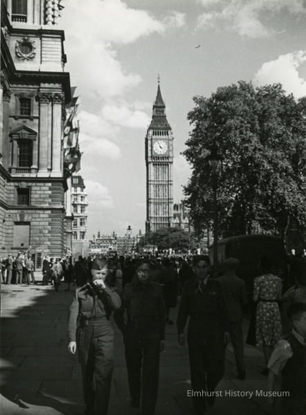 Three men in uniform in the forefront, walking away from London landmarks from the collection of Elmhurst resident Robert KrossPhotograph Details