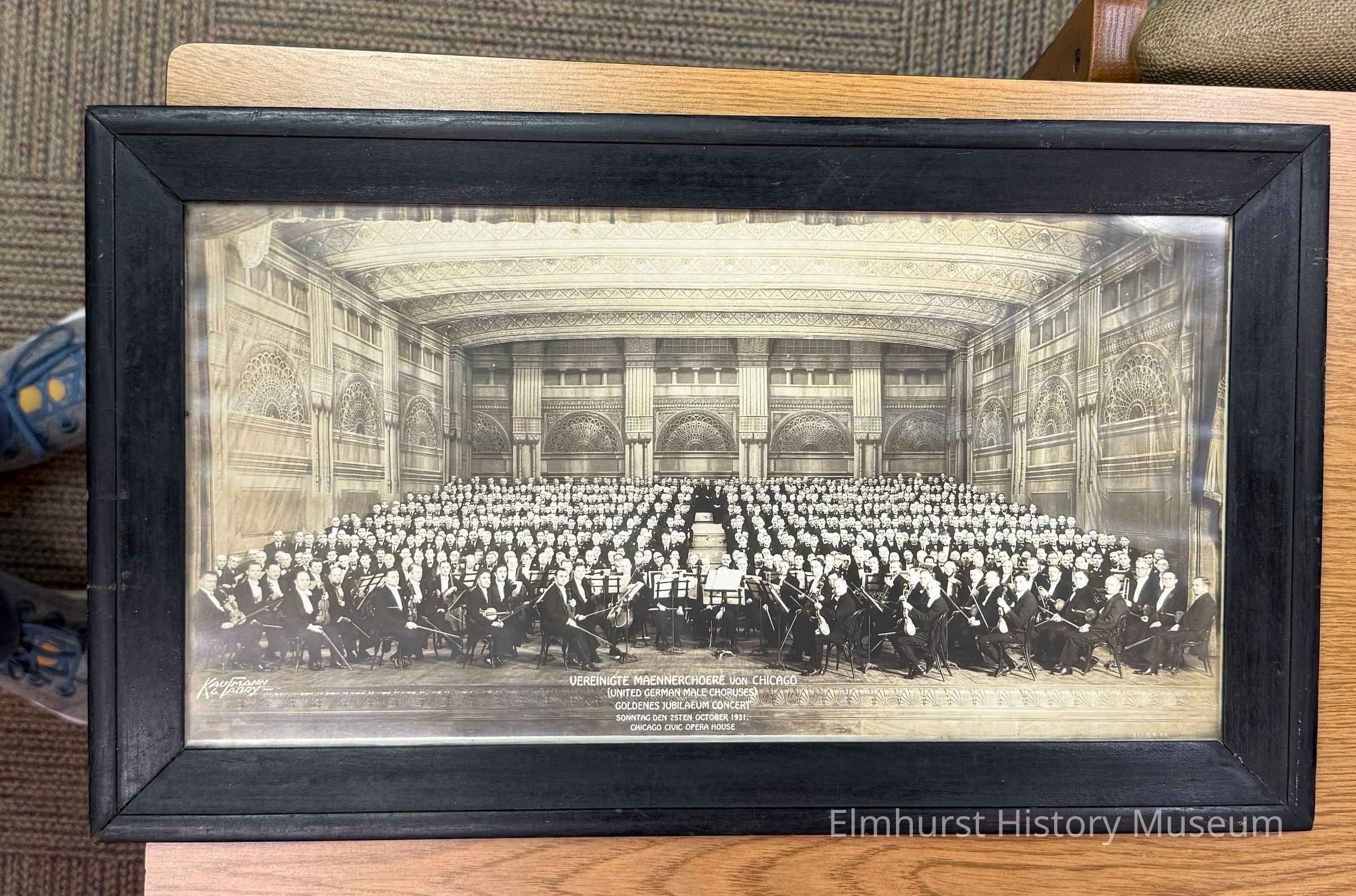 Framed group photograph of the United German Mens Chorus of Chicago for their golden jubilee concert at the Chicago Civic Opera house.Photograph Details