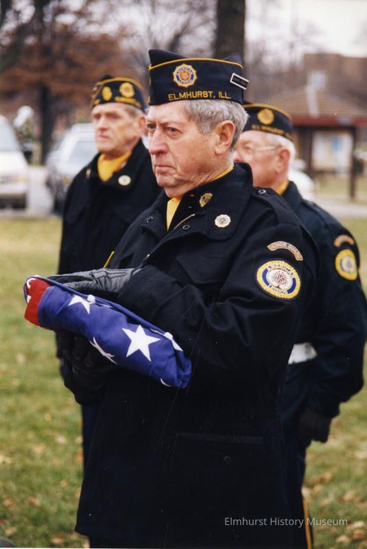 Three members of the American Legion. Patches on uniforms read "Honor Guard American Legion." Pearl Harbor Memorial Ceremony Dec. 7, 1997. This ceremony took place at the Veterans Memorial in Wilder Park, south of the Wilder Mansion.Photograph Details